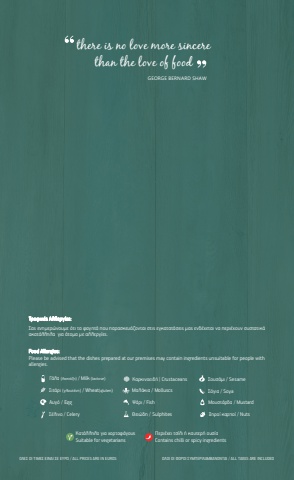there is no love more sincerethan the love of food%u03a4%u03c1%u03bf%u03c6%u03b9%u03ba%u03ad%u03c2 %u0391%u03bb%u03bb%u03b5%u03c1%u03b3%u03af%u03b5%u03c2:%u03a3%u03b1%u03c2 %u03b5%u03bd%u03b7%u03bc%u03b5%u03c1%u03ce%u03bd%u03bf%u03c5%u03bc%u03b5 %u03cc%u03c4%u03b9 %u03c4%u03b1 %u03c6%u03b1%u03b3%u03b7%u03c4%u03ac %u03c0%u03bf%u03c5 %u03c0%u03b1%u03c1%u03b1%u03c3%u03ba%u03b5%u03c5%u03ac%u03b6%u03bf%u03bd%u03c4%u03b1%u03b9 %u03c3%u03c4%u03b9%u03c2 %u03b5%u03b3%u03ba%u03b1%u03c4%u03b1%u03c4%u03ac%u03c3%u03b5%u03b9%u03c2 %u03bc%u03b1%u03c2 %u03b5%u03bd%u03b4%u03ad%u03c7%u03b5%u03c4%u03b1%u03b9 %u03bd%u03b1 %u03c0%u03b5%u03c1%u03b9%u03ad%u03c7%u03bf%u03c5%u03bd %u03c3%u03c5%u03c3%u03c4%u03b1%u03c4%u03b9%u03ba%u03ac%u03b1%u03ba%u03b1%u03c4%u03ac%u03bb%u03bb%u03b7%u03bb%u03b1 %u03b3%u03b9%u03b1 %u03ac%u03c4%u03bf%u03bc%u03b1 %u03bc%u03b5 %u03b1%u03bb%u03bb%u03b5%u03c1%u03b3%u03af%u03b5%u03c2.Food Allergies:Please be advised that the dishes prepared at our premises may contain ingredients unsuitable for people with allergies. GEORGE BERNARD SHAW%u039a%u03b1%u03c4%u03ac%u03bb%u03bb%u03b7%u03bb%u03bf %u03b3%u03b9%u03b1 %u03c7%u03bf%u03c1%u03c4%u03bf%u03c6%u03ac%u03b3%u03bf%u03c5%u03c2Suitable for vegetarians%u03a0%u03b5%u03c1%u03b9%u03ad%u03c7%u03b5%u03b9 %u03c4%u03c3%u03af%u03bb%u03b9 %u03ae %u03ba%u03b1%u03c5%u03c4%u03b5%u03c1%u03ae %u03bf%u03c5%u03c3%u03af%u03b1Contains chilli or spicy ingredients%u039f%u039b%u0395%u03a3 %u039f%u0399 %u03a4%u0399%u039c%u0395%u03a3 %u0395%u0399%u039d%u0391%u0399 %u03a3%u0395 %u0395%u03a5%u03a1%u03a9 / ALL PRICES ARE IN EUROS %u039f%u039b%u039f%u0399 %u039f%u0399 %u03a6%u039f%u03a1%u039f%u0399 %u03a3%u03a5%u039c%u03a0%u0395%u03a1%u0399%u039b%u0391%u039c%u0392%u0391%u039d%u039f%u039d%u03a4%u0391%u0399 / ALL TAXES ARE INCLUDED %u0391%u03c5%u03b3%u03cc / Egg%u0393%u03ac%u03bb%u03b1 (%u03bb%u03b1%u03ba%u03c4%u03cc%u03b6%u03b7) / Milk (lactose)%u03a3%u03ad%u03bb%u03b9%u03bd%u03bf / Celery%u03a3%u03b9%u03c4%u03ac%u03c1%u03b9 (%u03b3%u03bb%u03bf%u03c5%u03c4%u03ad%u03bd%u03b7) / Wheat(gluten)%u039c%u03bf%u03c5%u03c3%u03c4%u03ac%u03c1%u03b4%u03b1 / Mustard %u039e%u03b7%u03c1%u03bf%u03af %u03ba%u03b1%u03c1%u03c0%u03bf%u03af / Nuts%u03a3%u03bf%u03c5%u03c3%u03ac%u03bc%u03b9 / Sesame%u03a3%u03cc%u03b3%u03b9%u03b1 / SoyaSO2 %u0398%u03b5%u03b9%u03ce%u03b4%u03b7 / Sulphites%u039c%u03b1%u03bb%u03ac%u03ba%u03b9%u03b1 / Molluscs%u039a%u03b1%u03c1%u03ba%u03b9%u03bd%u03bf%u03b5%u03b9%u03b4%u03ae | Crustaceans%u03a8%u03ac%u03c1%u03b9 / Fish