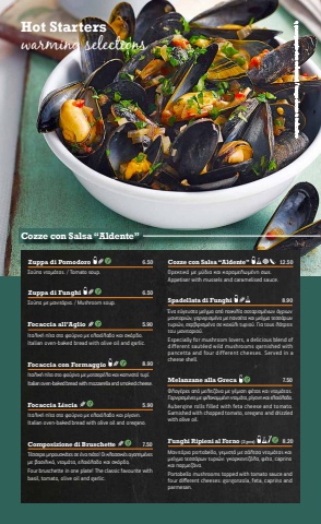 Hot Starterswarming selections%u03a3%u03bf%u03cd%u03c0%u03b1 %u03bd%u03c4%u03bf%u03bc%u03ac%u03c4%u03b1%u03c2. / Tomato soup.%u03a3%u03bf%u03cd%u03c0%u03b1 %u03bc%u03b5 %u03bc%u03b1%u03bd%u03b9%u03c4%u03ac%u03c1%u03b9%u03b1. / Mushroom soup.%u0399%u03c4%u03b1%u03bb%u03b9%u03ba%u03ae %u03c0%u03af%u03c4%u03b1 %u03c3%u03c4%u03bf %u03c6%u03bf%u03cd%u03c1%u03bd%u03bf %u03bc%u03b5 %u03b5%u03bb%u03b1%u03b9%u03cc%u03bb%u03b1%u03b4%u03bf %u03ba%u03b1%u03b9 %u03c3%u03ba%u03cc%u03c1%u03b4%u03bf.Italian oven-baked bread with olive oil and garlic.%u0399%u03c4%u03b1%u03bb%u03b9%u03ba%u03ae %u03c0%u03af%u03c4%u03b1 %u03c3%u03c4%u03bf %u03c6%u03bf%u03cd%u03c1%u03bd%u03bf %u03bc%u03b5 %u03bc%u03bf%u03c4%u03c3%u03b1%u03c1%u03ad%u03bb%u03b1 %u03ba%u03b1%u03b9 %u03ba%u03b1%u03c0%u03bd%u03b9%u03c3%u03c4%u03cc %u03c4%u03c5%u03c1%u03af.Italian oven-baked bread with mozzarella and smoked cheese.Italian oven-baked bread with olive oil and oregano.%u0399%u03c4%u03b1%u03bb%u03b9%u03ba%u03ae %u03c0%u03af%u03c4%u03b1 %u03c3%u03c4%u03bf %u03c6%u03bf%u03cd%u03c1%u03bd%u03bf %u03bc%u03b5 %u03b5%u03bb%u03b1%u03b9%u03cc%u03bb%u03b1%u03b4%u03bf %u03ba%u03b1%u03b9 %u03c1%u03af%u03b3%u03b1%u03bd%u03b7.%u03a4%u03ad%u03c3%u03c3%u03b5%u03c1%u03b9%u03c2 %u03bc%u03c0%u03c1%u03bf%u03c5%u03c3%u03ba%u03ad%u03c4%u03b5%u03c2 %u03c3%u03b5 %u03ad%u03bd%u03b1 %u03c0%u03b9%u03ac%u03c4%u03bf! %u039f%u03b9 %u03ba%u03bb%u03b1%u03c3%u03c3%u03b9%u03ba%u03ad%u03c2 %u03b1%u03b3%u03b1%u03c0%u03b7%u03bc%u03ad%u03bd%u03b5%u03c2 %u03bc%u03b5 %u03b2%u03b1%u03c3%u03b9%u03bb%u03b9%u03ba%u03cc, %u03bd%u03c4%u03bf%u03bc%u03ac%u03c4%u03b1, %u03b5%u03bb%u03b1%u03b9%u03cc%u03bb%u03b1%u03b4%u03bf %u03ba%u03b1%u03b9 %u03c3%u03ba%u03cc%u03c1%u03b4%u03bf.Four bruschette in one plate! The classic favourite with basil, tomato, olive oil and garlic.%u039f%u03c1%u03b5%u03ba%u03c4%u03b9%u03ba%u03cc %u03bc%u03b5 %u03bc%u03cd%u03b4%u03b9%u03b1 %u03ba%u03b1%u03b9 %u03ba%u03b1%u03c1%u03b1%u03bc%u03b5%u03bb%u03c9%u03bc%u03ad%u03bd%u03b7 %u03c3%u03c9%u03c2.Appetiser with mussels and caramelised sauce.%u0388%u03bd%u03b1 %u03b5%u03cd%u03b3%u03b5%u03c5%u03c3%u03c4%u03bf %u03bc%u03b5%u03af%u03b3%u03bc%u03b1 %u03b1%u03c0%u03cc %u03c0%u03bf%u03b9%u03ba%u03b9%u03bb%u03af%u03b1 %u03c3%u03bf%u03c4%u03b1%u03c1%u03b9%u03c3%u03bc%u03ad%u03bd%u03c9%u03bd %u03ac%u03b3%u03c1%u03b9%u03c9%u03bd%u03bc%u03b1%u03bd%u03b9%u03c4%u03b1%u03c1%u03b9%u03ce%u03bd, %u03b3%u03b1%u03c1%u03bd%u03b9%u03c1%u03b9%u03c3%u03bc%u03ad%u03bd%u03b1 %u03bc%u03b5 %u03c0%u03b1%u03bd%u03c3%u03ad%u03c4%u03b1 %u03ba%u03b1%u03b9 %u03bc%u03b5%u03af%u03b3%u03bc%u03b1 %u03c4%u03b5%u03c3%u03c3%u03ac%u03c1%u03c9%u03bd %u03c4%u03c5%u03c1%u03b9%u03ce%u03bd, %u03c3%u03b5%u03c1%u03b2%u03b9%u03c1%u03b9%u03c3%u03bc%u03ad%u03bd%u03bf %u03c3%u03b5 %u03ba%u03bf%u03c7%u03cd%u03bb%u03b9 %u03c4%u03c5%u03c1%u03b9%u03bf%u03cd. %u0393%u03b9%u03b1 %u03c4%u03bf%u03c5%u03c2 %u03bb%u03ac%u03c4%u03c1%u03b5%u03b9%u03c2 %u03c4%u03bf%u03c5 %u03bc%u03b1%u03bd%u03b9%u03c4%u03b1%u03c1%u03b9%u03bf%u03cd.Especially for mushroom lovers, a delicious blend ofdifferent saut%u00e9ed wild mushrooms garnished withpancetta and four different cheeses. Served in acheese shell.%u03a6%u03bb%u03bf%u03b3%u03ad%u03c1%u03b5%u03c2 %u03b1%u03c0%u03cc %u03bc%u03b5%u03bb%u03b9%u03c4%u03b6%u03ac%u03bd%u03b1 %u03bc%u03b5 %u03b3%u03ad%u03bc%u03b9%u03c3%u03b7 %u03c6%u03ad%u03c4%u03b1%u03c2 %u03ba%u03b1%u03b9 %u03bd%u03c4%u03bf%u03bc%u03ac%u03c4%u03b1%u03c2. %u0393%u03b1%u03c1%u03bd%u03b9%u03c1%u03b9%u03c3%u03bc%u03ad%u03bd%u03b5%u03c2 %u03bc%u03b5 %u03c8%u03b9%u03bb%u03bf%u03ba%u03bf%u03bc%u03bc%u03ad%u03bd%u03b7 %u03bd%u03c4%u03bf%u03bc%u03ac%u03c4%u03b1, %u03c1%u03af%u03b3%u03b1%u03bd%u03b7 %u03ba%u03b1%u03b9 %u03b5%u03bb%u03b1%u03b9%u03cc%u03bb%u03b1%u03b4%u03bf.Aubergine rolls filled with feta cheese and tomato.Garnished with chopped tomato, oregano and drizzled with olive oil.%u039c%u03b1%u03bd%u03b9%u03c4%u03ac%u03c1%u03b9%u03b1 portobello, %u03b3%u03b5%u03bc%u03b9%u03c3%u03c4%u03ac %u03bc%u03b5 %u03c3%u03ac%u03bb%u03c4%u03c3%u03b1 %u03bd%u03c4%u03bf%u03bc%u03ac%u03c4%u03b1%u03c2 %u03ba%u03b1%u03b9%u03bc%u03b5%u03af%u03b3%u03bc%u03b1 %u03c4%u03b5%u03c3%u03c3%u03ac%u03c1%u03c9%u03bd %u03c4%u03c5%u03c1%u03b9%u03ce%u03bd: %u03b3%u03ba%u03bf%u03c1%u03ba%u03bf%u03bd%u03c4%u03b6%u03cc%u03bb%u03b1, %u03c6%u03ad%u03c4%u03b1, caprino %u03ba%u03b1%u03b9 %u03c0%u03b1%u03c1%u03bc%u03b5%u03b6%u03ac%u03bd%u03b1.Portobello mushrooms topped with tomato sauce andfour different cheeses: gorgonzola, feta, caprino and parmesan.Focaccia all%u2019Aglio 5.90Funghi Ripieni al Forno (2 pcs) SO2 8.20Melanzane alla Greca 7.50Spadellata di Funghi SO2 8.90Zuppa di Pomodoro 6.50 Cozze con Salsa %u201cAldente%u201d SO2 12.50Zuppa di Funghi 6.50Focaccia con Formaggio 8.90Focaccia Liscia 5.90Composizione di Bruschette 7.50%u03b7 %u03c6%u03c9%u03c4%u03bf%u03b3%u03c1%u03b1%u03c6%u03af%u03b1 %u03b5%u03af%u03bd%u03b1%u03b9 %u03b5%u03bd%u03b4%u03b5%u03b9%u03ba%u03c4%u03b9%u03ba%u03ae / image shown is indicativeCozze con Salsa %u201cAldente%u201d