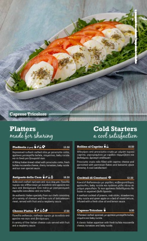 Cold Startersa cool satisfactionPlattersmade for sharingSO2Caprese Tricolore%u039a%u03bb%u03b1%u03c3%u03c3%u03b9%u03ba%u03cc %u03b9%u03c4%u03b1%u03bb%u03b9%u03ba%u03cc %u03bf%u03c1%u03b5%u03ba%u03c4%u03b9%u03ba%u03cc, %u03bc%u03b5 %u03c6%u03c1%u03ad%u03c3%u03ba%u03b9%u03b1 %u03bc%u03bf%u03c4%u03c3%u03b1%u03c1%u03ad%u03bb%u03b1 bufala, %u03bd%u03c4%u03bf%u03bc%u03ac%u03c4%u03b1 %u03ba%u03b1%u03b9 baby rucola. 9.50A classic Italian appetiser with fresh bufala mozzarella cheese, tomatoes and baby rucola.Cocktail di Crostacei 12.50Rollino al Caprino 10.50%u03a6%u03bb%u03bf%u03b3%u03ad%u03c1%u03b5%u03c2 %u03b1%u03c0%u03cc prosciutto crudo %u03bc%u03b5 %u03b3%u03ad%u03bc%u03b9%u03c3%u03b7 %u03c4%u03c5%u03c1%u03b9%u03bf%u03cdcaprino, %u03b3%u03b1%u03c1%u03bd%u03b9%u03c1%u03b9%u03c3%u03bc%u03ad%u03bd%u03b5%u03c2 %u03bc%u03b5 %u03bd%u03b9%u03c6%u03ac%u03b4%u03b5%u03c2 %u03c0%u03b1%u03c1%u03bc%u03b5%u03b6%u03ac%u03bd%u03b1%u03c2 %u03ba%u03b1%u03b9%u03b2%u03b1%u03bb%u03c3%u03ac%u03bc%u03b9%u03ba%u03bf. %u0394%u03c1%u03bf%u03c3%u03b5%u03c1%u03ae %u03b1%u03c0%u03cc%u03bb%u03b1%u03c5%u03c3%u03b7!Prosciutto crudo rolls filled with caprino cheese andgarnished with parmesan flakes and balsamic glazedressing. A cool satisfaction!%u039a%u03bf%u03ba%u03c4%u03ad%u03b9%u03bb %u03b8%u03b1%u03bb%u03b1%u03c3%u03c3%u03b9%u03bd%u03ce%u03bd %u03bc%u03b5 %u03b3%u03b1%u03c1%u03af%u03b4%u03b5%u03c2, %u03ba%u03b1%u03b2%u03bf%u03c5%u03c1%u03bf%u03c0%u03cc%u03b4%u03b1%u03c1%u03b1, %u03c6%u03c1%u03ac%u03bf%u03c5%u03bb%u03b5%u03c2, baby rucola %u03ba%u03b1%u03b9 %u03c0%u03c1%u03ac%u03c3%u03b9%u03bd%u03bf %u03bc%u03ae%u03bb%u03bf %u03c0%u03ac%u03bd%u03c9 %u03c3%u03b5%u03bc%u03b5%u03af%u03b3%u03bc%u03b1 %u03bc%u03b1%u03c1%u03bf%u03c5%u03bb%u03b9%u03ce%u03bd. %u03a4%u03bf %u03c3%u03c9%u03c2 %u03c6%u03c1%u03ad%u03c3%u03ba%u03bf%u03c5 %u03bb%u03b1%u03b4%u03bf%u03bb%u03ad%u03bc%u03bf%u03bd%u03bf%u03c5 %u03b8%u03b1 %u03b4%u03ce%u03c3%u03b5%u03b9 %u03c4%u03b7 %u03c7%u03b1%u03c1%u03b9%u03c3%u03c4%u03b9%u03ba%u03ae %u03b2%u03bf%u03bb%u03ae %u03b4%u03c1%u03bf%u03c3%u03b9%u03ac%u03c2.A seafood cocktail of prawns, crab sticks, strawberries, baby rucola and green apple on a bed of mixed lettuce,infused with a fresh olive oil and lemon sauce.SO218.50Piadinola (6 pcs) 13.50Antipasto della Casa%u03a7%u03bf%u03c1%u03c4%u03b1%u03c3%u03c4%u03b9%u03ba%u03ae %u03c4%u03c5%u03bb%u03b9%u03c7%u03c4%u03ae %u03b9%u03c4%u03b1%u03bb%u03b9%u03ba%u03ae %u03c0%u03af%u03c4%u03b1 %u03bc%u03b5 prosciutto cotto,%u03c6%u03c1%u03ad%u03c3%u03ba%u03b9%u03b1 %u03bc%u03bf%u03c4%u03c3%u03b1%u03c1%u03ad%u03bb%u03b1 bufala, %u03bd%u03c4%u03bf%u03bc%u03b1%u03c4%u03af%u03bd%u03b9%u03b1, baby rucola%u03ba%u03b1%u03b9 %u03c4%u03b7 %u03b4%u03b9%u03ba%u03b9%u03ac %u03bc%u03b1%u03c2 %u03be%u03b5%u03c7%u03c9%u03c1%u03b9%u03c3%u03c4%u03ae %u03c3%u03c9%u03c2.A filling Italian bread rolled with prosciutto cotto, freshbufala mozzarella cheese, cherry tomatoes, baby rucola and our own special sauce.An authentic Italian specialty from our chefs consistingof a variety of cheeses and fine cuts of delicatessenmeat, served with fruit and a raspberry sauce.%u0391%u03c5%u03b8%u03b5%u03bd%u03c4%u03b9%u03ba%u03ae %u03b9%u03c4%u03b1%u03bb%u03b9%u03ba%u03ae %u03c0%u03c1%u03cc%u03c4%u03b1%u03c3%u03b7 %u03b1%u03c0%u03cc %u03c4%u03bf%u03c5%u03c2 %u03c3%u03b5%u03c6 %u03bc%u03b1%u03c2. %u03a0%u03bf%u03b9%u03ba%u03b9%u03bb%u03af%u03b1%u03c4%u03c5%u03c1%u03b9%u03ce%u03bd %u03ba%u03b1%u03b9 %u03b1%u03bb%u03bb%u03b1%u03bd%u03c4%u03b9%u03ba%u03ce%u03bd %u03bc%u03b5 %u03c3%u03c5%u03bd%u03bf%u03b4%u03b5%u03af%u03b1 %u03b1%u03c0%u03cc %u03c6%u03c1%u03bf%u03cd%u03c4%u03b1 %u03ba%u03b1%u03b9%u03c3%u03c9%u03c2 %u03b1%u03c0%u03cc %u03b2%u03b1%u03c4%u03cc%u03bc%u03bf%u03c5%u03c1%u03b1. %u0388%u03bd%u03b1 %u03c0%u03b9%u03ac%u03c4%u03bf %u03bc%u03b5 %u03b3%u03b1%u03c3%u03c4%u03c1%u03bf%u03bd%u03bf%u03bc%u03b9%u03ba%u03ae%u03c3%u03c6%u03c1%u03b1%u03b3%u03af%u03b4%u03b1 %u03ba%u03b1%u03c4%u03b5%u03c5%u03b8%u03b5%u03af%u03b1%u03bd %u03b1%u03c0%u03cc %u03c4%u03b7%u03bd %u0399%u03c4%u03b1%u03bb%u03af%u03b1.SO2%u03a0%u03bf%u03b9%u03ba%u03b9%u03bb%u03af%u03b1 %u03b5%u03ba%u03bb%u03b5%u03ba%u03c4%u03ce%u03bd, %u03b9%u03c4%u03b1%u03bb%u03b9%u03ba%u03ce%u03bd %u03c4%u03c5%u03c1%u03b9%u03ce%u03bd %u03bc%u03b5 %u03c3%u03c5%u03bd%u03bf%u03b4%u03b5%u03af%u03b1 %u03b1%u03c0%u03cc %u03c6%u03c1%u03bf%u03cd%u03c4%u03b1 %u03ba%u03b1%u03b9 %u03c3%u03c9%u03c2 %u03b1%u03c0%u03cc %u03b2%u03b1%u03c4%u03cc%u03bc%u03bf%u03c5%u03c1%u03b1.Cheese Platter SO2 17.50A variety of fine Italian cheese cuts served with fruit and a raspberry sauce.%u03b7 %u03c6%u03c9%u03c4%u03bf%u03b3%u03c1%u03b1%u03c6%u03af%u03b1 %u03b5%u03af%u03bd%u03b1%u03b9 %u03b5%u03bd%u03b4%u03b5%u03b9%u03ba%u03c4%u03b9%u03ba%u03ae / image shown is indicativeCaprese Tricolore