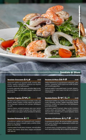 SO2SO2Insalata Croccante%u03a4%u03c1%u03b1%u03b3%u03b1%u03bd%u03b9%u03c3%u03c4%u03ae %u03c3%u03b1%u03bb%u03ac%u03c4%u03b1 %u03bc%u03b5 %u03b6%u03c5%u03bc%u03b1%u03c1%u03b9%u03ba%u03ac fusilli, %u03c0%u03b1%u03bd%u03c3%u03ad%u03c4%u03b1, baby rucola, %u03bd%u03b9%u03c6%u03ac%u03b4%u03b5%u03c2 %u03c0%u03b1%u03c1%u03bc%u03b5%u03b6%u03ac%u03bd%u03b1%u03c2, %u03ba%u03cc%u03ba%u03ba%u03b9%u03bd%u03b5%u03c2 %u03ba%u03b1%u03b9 %u03ba%u03af%u03c4%u03c1%u03b9%u03bd%u03b5%u03c2 %u03c0%u03b9%u03c0%u03b5%u03c1%u03b9%u03ad%u03c2, %u03ba%u03b1%u03c1%u03cd%u03b4%u03b9%u03b1 %u03ba%u03b1%u03b9 %u03c3%u03ac%u03bb%u03c4%u03c3%u03b1 pesto.A crunchy salad with fusilli pasta, pancetta, baby rucola, parmesan flakes, red and yellow peppers, walnuts and pesto sauce.14.9014.3013.90Insalata CaprinoInsalata Primavera16.8014.6015.50%u0397 %u03b1%u03bd%u03bf%u03b9%u03be%u03b9%u03ac%u03c4%u03b9%u03ba%u03b7 %u03c3%u03b1%u03bb%u03ac%u03c4%u03b1 %u03b1%u03c0%u03cc %u03b6%u03c5%u03bc%u03b1%u03c1%u03b9%u03ba%u03ac fusilli, %u03bd%u03c4%u03bf%u03bc%u03ac%u03c4%u03b5%u03c2, %u03ba%u03cc%u03ba%u03ba%u03b9%u03bd%u03b5%u03c2 %u03ba%u03b1%u03b9 %u03ba%u03af%u03c4%u03c1%u03b9%u03bd%u03b5%u03c2 %u03c0%u03b9%u03c0%u03b5%u03c1%u03b9%u03ad%u03c2, %u03c6%u03ad%u03c4%u03b1, %u03c1%u03bf%u03b4%u03ad%u03bb%u03b5%u03c2 %u03b5%u03bb%u03b9%u03ac%u03c2,%u03c1%u03af%u03b3%u03b1%u03bd%u03b7 %u03ba%u03b1%u03b9 %u03b5%u03bb%u03b1%u03b9%u03cc%u03bb%u03b1%u03b4%u03bf.A spring salad of fusilli pasta, tomatoes, red and yellow peppers, feta cheese, sliced olives, oregano and drizzled with olive oil.Insalata di Salmone%u0397 %u03b1%u03c1%u03b9%u03c3%u03c4%u03bf%u03ba%u03c1%u03b1%u03c4%u03b9%u03ba%u03ae %u03b5%u03c0%u03b9%u03bb%u03bf%u03b3%u03ae. %u039c%u03b5 %u03ba%u03b1%u03c0%u03bd%u03b9%u03c3%u03c4%u03cc %u03c3%u03bf%u03bb%u03bf%u03bc%u03cc, %u03bd%u03c4%u03bf%u03bc%u03b1%u03c4%u03af%u03bd%u03b9%u03b1, ranch sauce %u03ba%u03b1%u03b9 %u03be%u03b7%u03c1%u03ac %u03c3%u03cd%u03ba%u03b1 %u03c3%u03b5%u03c1%u03b2%u03b9%u03c1%u03b9%u03c3%u03bc%u03ad%u03bd%u03b1 %u03c3%u03b5 %u03b2%u03ac%u03c3%u03b7 %u03b1%u03c0%u03cc %u03c0%u03bf%u03b9%u03ba%u03b9%u03bb%u03af%u03b1 %u03bc%u03b1%u03c1%u03bf%u03c5%u03bb%u03b9%u03ce%u03bd.A refined choice. Smoked salmon, cherry tomatoes,ranch sauce and dried figs, all on a bed of mixed lettuce.Insalata EstivaInsalata di Mare%u03a3%u03b1%u03bb%u03ac%u03c4%u03b1 %u03b8%u03b1%u03bb%u03b1%u03c3%u03c3%u03b9%u03bd%u03ce%u03bd %u03bc%u03b5 %u03bc%u03b1%u03c1%u03b9%u03bd%u03b1%u03c1%u03b9%u03c3%u03bc%u03ad%u03bd%u03b1 %u03ba%u03b1%u03bb%u03b1%u03bc%u03ac%u03c1%u03b9%u03b1, %u03bc%u03cd%u03b4%u03b9%u03b1, %u03b3%u03b1%u03c1%u03af%u03b4%u03b5%u03c2, %u03bd%u03c4%u03bf%u03bc%u03b1%u03c4%u03af%u03bd%u03b9%u03b1, ranch sauce %u03ba%u03b1%u03b9 %u03ac%u03bd%u03b7%u03b8%u03bf %u03c3%u03b5 %u03b2%u03ac%u03c3%u03b7 %u03b1%u03c0%u03cc %u03c0%u03bf%u03b9%u03ba%u03b9%u03bb%u03af%u03b1 %u03bc%u03b1%u03c1%u03bf%u03c5%u03bb%u03b9%u03ce%u03bd.Seafood salad of marinated squid, mussels, prawns,cherry tomatoes, ranch sauce and dill, all on a bed ofmixed lettuce.%u039a%u03b1%u03bb%u03bf%u03ba%u03b1%u03b9%u03c1%u03b9%u03bd%u03ae %u03c3%u03b1%u03bb%u03ac%u03c4%u03b1 %u03bc%u03b5 %u03ba%u03b1%u03c1%u03b4%u03b9%u03ad%u03c2 %u03b1%u03c0%u03cc %u03c3%u03c0%u03b1%u03bd%u03ac%u03ba%u03b9 %u03ba%u03b1%u03b9 babyrucola, %u03ba%u03c1%u03bf%u03c5%u03c4%u03cc%u03bd%u03b9%u03b1, %u03c3%u03bf%u03c5%u03c3%u03ac%u03bc%u03b9, %u03bd%u03b9%u03c6%u03ac%u03b4%u03b5%u03c2 %u03c0%u03b1%u03c1%u03bc%u03b5%u03b6%u03ac%u03bd%u03b1%u03c2, %u03bb%u03b9%u03b1%u03c3%u03c4%u03ad%u03c2 %u03bd%u03c4%u03bf%u03bc%u03ac%u03c4%u03b5%u03c2, %u03c0%u03b9%u03bd%u03cc%u03bb%u03b9%u03b1 %u03ba%u03b1%u03b9 %u03b3%u03bb%u03c5%u03ba%u03cc %u03c3%u03c9%u03c2 %u03b1%u03c0%u03cc %u03b2%u03b1%u03bb%u03c3%u03ac%u03bc%u03b9%u03ba%u03bf, %u03bc%u03bf%u03c5%u03c3%u03c4%u03ac%u03c1%u03b4%u03b1 %u03ba%u03b1%u03b9 %u03bc%u03ad%u03bb%u03b9.A summery salad of spinach, baby rucola, croutons,sesame seeds, parmesan flakes, sundried tomatoesand pine nuts, drizzled with a sweet balsamic saucewith mustard and honey.%u039c%u03b5 %u03b2%u03ac%u03c3%u03b7 %u03b1%u03c0%u03cc %u03ba%u03b1%u03c1%u03b4%u03b9%u03ad%u03c2 %u03c3%u03c0%u03b1%u03bd%u03b1%u03ba%u03b9%u03bf%u03cd %u03ba%u03b1%u03b9 baby rucola, %u03c4%u03c5%u03c1%u03af caprino, %u03bb%u03b9%u03b1%u03c3%u03c4%u03ad%u03c2 %u03bd%u03c4%u03bf%u03bc%u03ac%u03c4%u03b5%u03c2, %u03c0%u03b9%u03bd%u03cc%u03bb%u03b9%u03b1, %u03ba%u03b1%u03c1%u03cc%u03c4%u03bf %u03ba%u03b1%u03b9 %u03ba%u03c1%u03bf%u03c5%u03c4%u03cc%u03bd%u03b9%u03b1, %u03c3%u03b5 %u03ad%u03bd%u03b1 %u03b4%u03c1%u03bf%u03c3%u03b5%u03c1%u03cc %u03bd%u03c4%u03c1%u03ad%u03c3%u03b9%u03bd%u03b3%u03ba %u03b1%u03c0%u03cc %u03b3%u03b9%u03b1%u03bf%u03cd%u03c1%u03c4%u03b9, %u03b2%u03b1%u03bb%u03c3%u03ac%u03bc%u03b9%u03ba%u03bf %u03ba%u03b1%u03b9 %u03bc%u03ad%u03bb%u03b9.Caprino cheese, sundried tomatoes, pine nuts, carrots and croutons on a bed of spinach and baby rucola,drizzled with a cool yogurt, honey and balsamic dressing.SO2 SO2%u03b7 %u03c6%u03c9%u03c4%u03bf%u03b3%u03c1%u03b1%u03c6%u03af%u03b1 %u03b5%u03af%u03bd%u03b1%u03b9 %u03b5%u03bd%u03b4%u03b5%u03b9%u03ba%u03c4%u03b9%u03ba%u03ae / image shown is indicativeInsalata di Mare